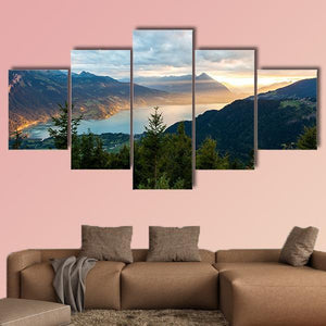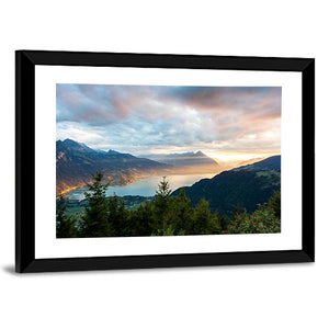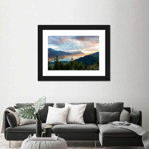 Sunset View Of Thun Lake shows mountains, a calm lake and a lit-up village along the shore beneath dramatic sunset clouds. Blue, green and orange tones create a serene, majestic atmosphere with a peaceful, expansive feel. The print works well as wall decor in modern or nature-focused rooms.