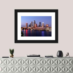 Tampa skyline at twilight, captured as a photorealistic cityscape with skyscrapers, city lights, and reflections on the waterfront. The blue, orange, white and black palette creates a vibrant, urban mood. A good fit for modern home décor and living spaces that want a city-focused focal piece.