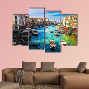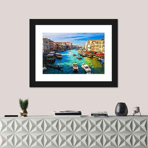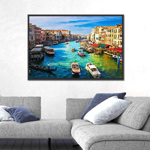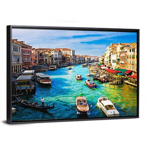 A realistic view of Venice’s Grand Canal showing gondolas, motorboats and classic Venetian buildings. The eye-level perspective and leading lines draw you down a vibrant, bustling, sunny waterway rendered in blue, teal, brown and orange. Works well in modern homes or travel-themed rooms as a colorful focal piece.