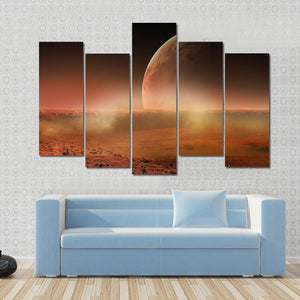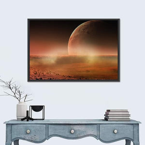 Explore the mysterious landscape of Mars as seen from Phobos in this captivating canvas art. With a palette of red, orange, brown, and black, it evokes an atmospheric and otherworldly vibe that complements modern décor beautifully.