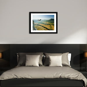 A wide panoramic canvas featuring a person base jumping from a steep cliff over a green mountain valley, with a village below and a blue, cloud-speckled sky. The image feels adventurous and serene at once, suited to modern living rooms or offices that favor bold landscape wall art.