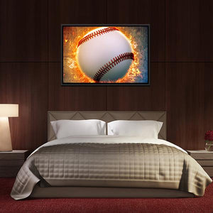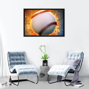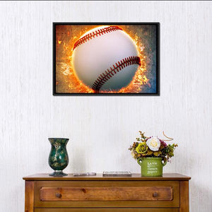 This dynamic canvas art captures a baseball engulfed in fiery flames, creating an intense and powerful visual. The close-up composition showcases striking red stitches against a backdrop of vivid orange and yellow, perfect for adding energy to any sports-themed decor.