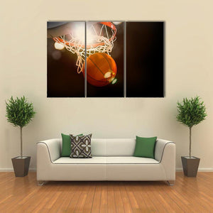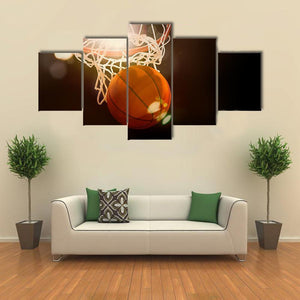 A close-up of a basketball swishing through the hoop, captured with motion blur and lens flare for a dramatic, energetic mood. The orange, white, black and gold palette and modern style make it a strong choice for sports-themed rooms or modern living spaces.