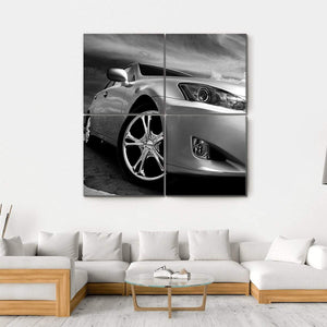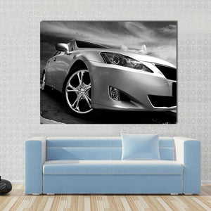 This striking canvas features a close-up of a sleek sports car, showcasing its powerful front fender and wheel against a dramatic monochrome sky. Ideal for those who appreciate modern art, this piece adds a bold touch to any wall.