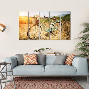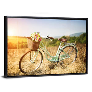 This charming canvas art depicts a vintage bicycle adorned with a basket of flowers, bathed in warm sunlight that filters through dry grass. Its serene and nostalgic vibe brings a touch of rustic charm, making it a lovely addition to any room decor.