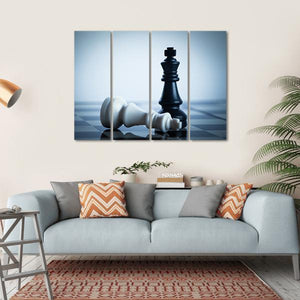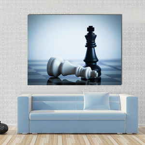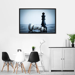 This striking wall art features a dramatic scene of chess pieces, including a standing king and a fallen king, evoking a sense of strategy and contemplation. The minimalist palette of black and white adds a modern touch, making it an eye-catching addition to any room decor.
