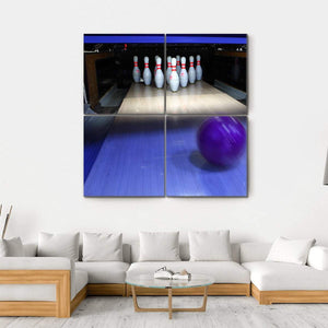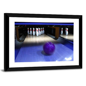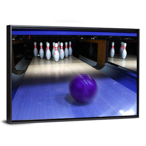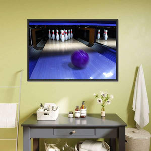 Capture the thrill of the bowling alley with this dynamic canvas art featuring a purple bowling ball in motion surrounded by pins. The vibrant colors and motion blur create an action-packed atmosphere, perfect for a game room or entertainment space.