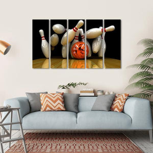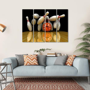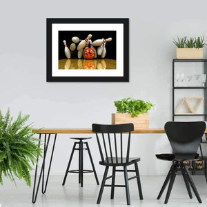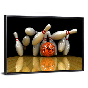 This striking canvas artwork features a dynamic view of an orange bowling ball poised for a strike among white bowling pins. The swirling pattern on the ball and the energetic contrast of colors create a dramatic effect, perfect for adding a touch of sports enthusiasm to any space.