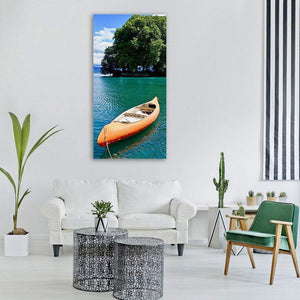 This canvas shows an orange canoe floating on turquoise water beside a green island tree under a blue sky with white clouds, conveying a peaceful, calm mood. The photorealistic, naturalistic landscape fits well in modern or nature-inspired room decor.