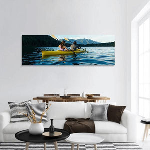 This realistic landscape shows two people in a yellow kayak gliding across calm blue-green water, with tree-covered mountains in the background. The daytime, clear-weather scene feels serene and adventurous. It suits modern or nature-inspired rooms as a quiet wall accent.