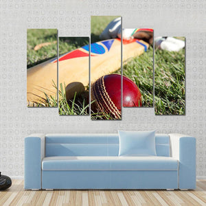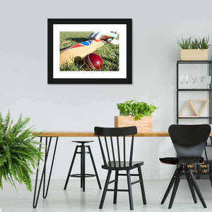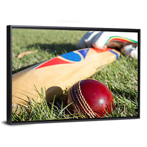 This canvas art captures the essence of cricket with a close-up view of a red cricket ball and wooden bat against a backdrop of grass. Perfect for sports enthusiasts, it brings a vibrant and energetic atmosphere to your space.