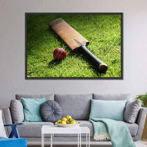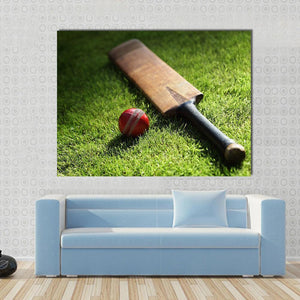 This canvas artwork features a cricket bat and ball resting on lush green grass, creating a sporty and focused atmosphere. The realistic depiction, enhanced by sunlight casting soft shadows, brings an outdoor vibe that’s perfect for any sports enthusiast.