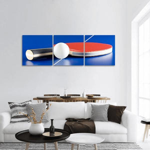 Close-up of a ping pong paddle and ball on a blue playing surface, with a crisp white line across the frame. The sporty, dynamic composition and modern minimalist palette of blue, red, black and white fits contemporary game rooms or modern living spaces.