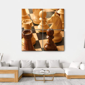 This canvas art features an intricate arrangement of chess pieces on a board, capturing the strategic and focused nature of the game. With a rich palette of browns and blacks, it's a captivating addition to any space for chess enthusiasts and art lovers alike.