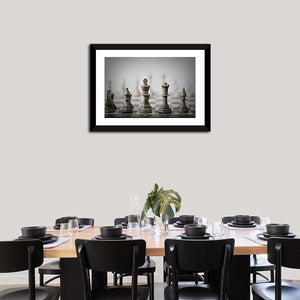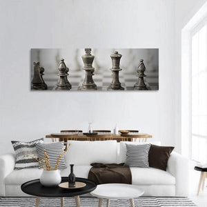 Close-up chess pieces and a chess board are shown in gray, white, and black, creating a strategic, focused, classic mood. The modern, dramatic composition fits well in contemporary or classic living rooms and offices.