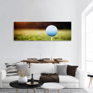 A photorealistic view of a golf ball on a tee with sunlight filtering through trees and the green course visible in the background. The image feels calm, focused, and sporty and works well in modern or sports-themed rooms.