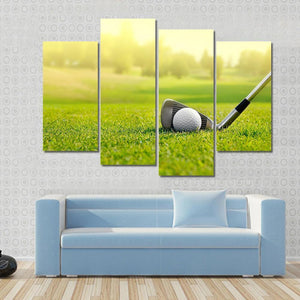 This canvas art captures a serene moment on the golf course with a close-up of a golf ball and club, highlighted by morning sunlight and dewdrops on lush green grass. Ideal for sports enthusiasts and nature lovers alike.