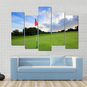 This beautiful canvas features a serene golf course scene, complete with a signature red flag in a hole. The composition, balanced by rich greens and a blue sky filled with clouds, brings a peaceful outdoor ambiance to any space.