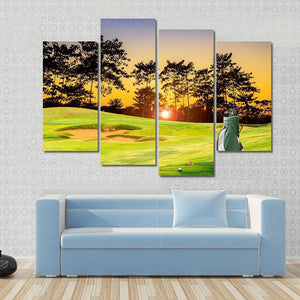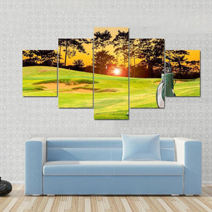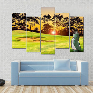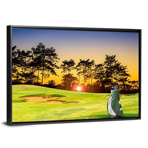 This canvas art beautifully captures a serene golf course at sunset, featuring a golf bag with clubs and sand traps. The warm tones of green, orange, and blue create a peaceful atmosphere, making it a lovely addition to any sports enthusiast's decor.