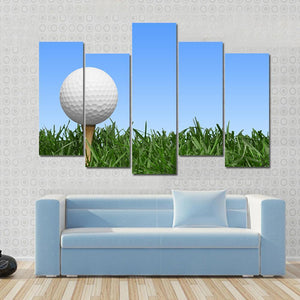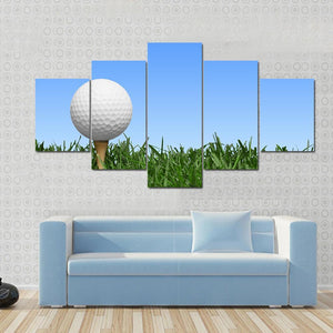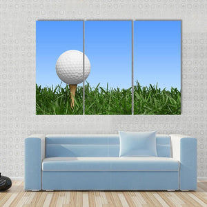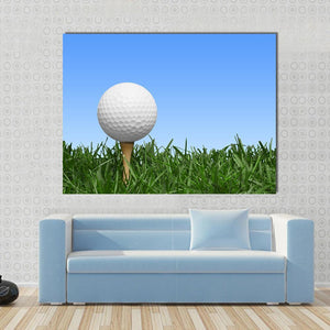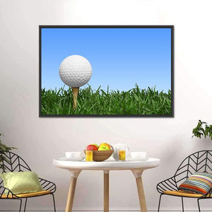 This canvas art captures a serene moment with a dimpled golf ball resting on a wooden tee amidst soft green grass. Its realistic style and peaceful colors make it a simple yet striking addition to any space.