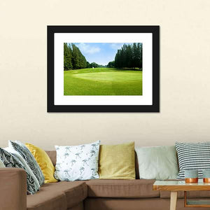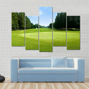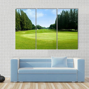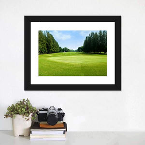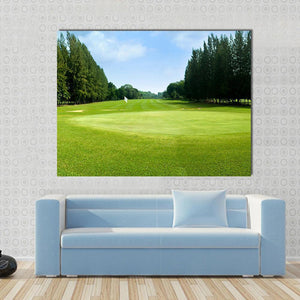 This canvas artwork captures a serene golf course set against a tranquil sky, emphasizing the lush greens and deep blues of the landscape. The realistic depiction of trees and a golf flag adds charm to any room.