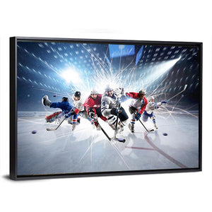 Experience the excitement of ice hockey with this dynamic canvas art featuring players in action. The energetic composition showcases glowing light effects and captures the intensity of the game, making it a perfect piece for sports enthusiasts.