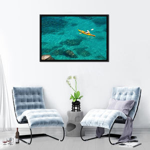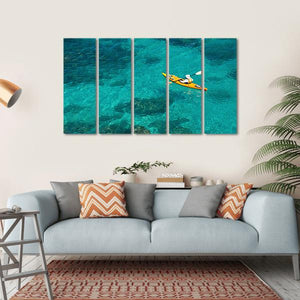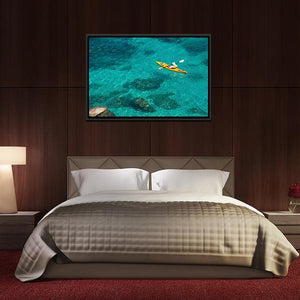 This vibrant canvas features a serene scene of a kayaker navigating through turquoise waters, surrounded by shimmering sunlight illuminating underwater rocks. It brings a peaceful, adventurous vibe to any space.