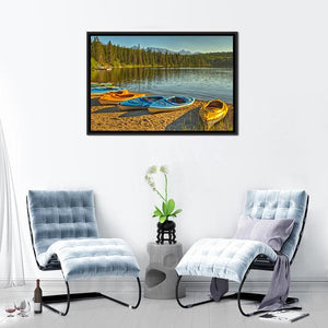 This canvas features five kayaks lined up on the sandy shore of a tranquil lake, surrounded by a dense evergreen forest and majestic snow-capped mountains. The serene blues and greens create a peaceful atmosphere, perfect for bringing a touch of nature indoors.