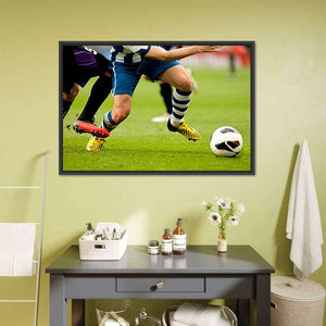 This dynamic canvas art captures a close-up action shot of two soccer players in motion, set against a vibrant green grass field. Perfect for sports enthusiasts, it brings energy and competition to any space.