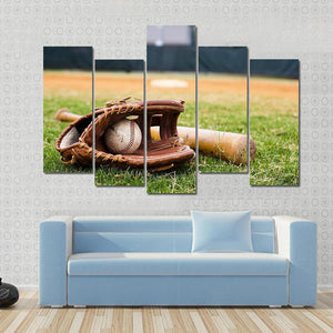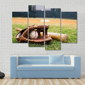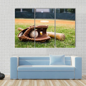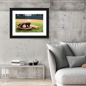 This canvas art captures the relaxed nostalgia of baseball with a worn glove and bat set against a grassy field. The earthy palette of browns and greens brings a sporty essence, making it a great piece for any sports enthusiast.
