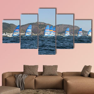 Photorealistic canvas of Brazil’s coast showing multiple colorful sailboats, choppy blue-green water, and coastal mountains. The scene uses a rule-of-thirds composition and carries an active, competitive, scenic mood that fits modern or coastal room decor.