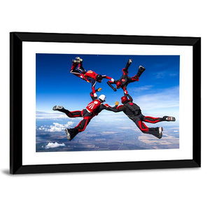 This canvas art captures four skydivers in dynamic motion against a bright blue sky. The exciting blend of red and black suits creates an adventurous vibe that would energize any space. Perfect for sports enthusiasts or anyone wanting to add a sense of extreme adventure to their decor.