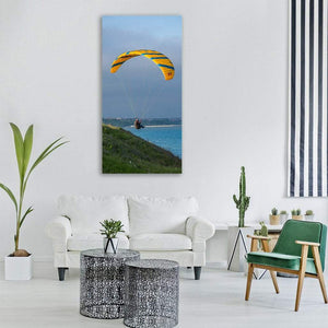 A yellow-and-blue striped paraglider drifts above a green grassy cliff and blue ocean under a light blue sky, capturing a bright, adventurous yet serene moment. The modern, vibrant landscape print suits coastal and contemporary room decor where a sense of motion and calm is welcome.