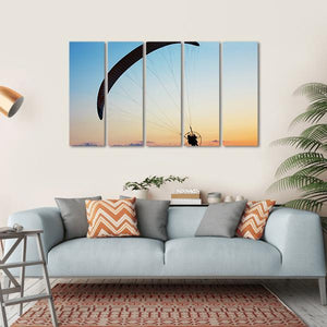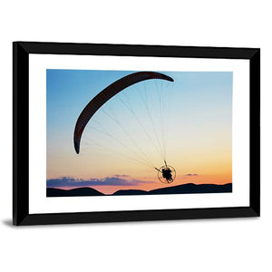 This canvas art features a silhouette of a paramotor pilot soaring over mountains at sunset. The dynamic arc of the flight captures an adventurous yet serene mood, with a vibrant palette of blues, oranges, and yellows.