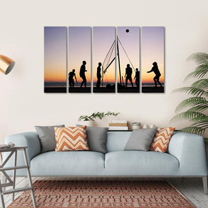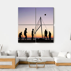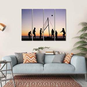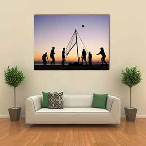 This canvas art captures the dynamic energy of people playing volleyball at the beach during a vibrant sunset. With silhouettes set against a rich palette of purple, orange, and black, it brings a lively yet serene atmosphere to any space.