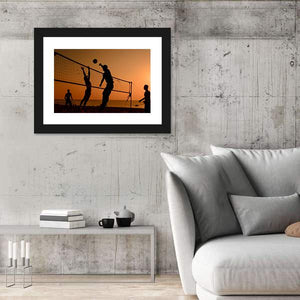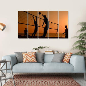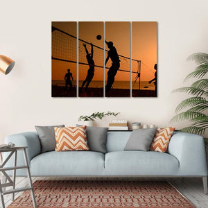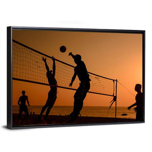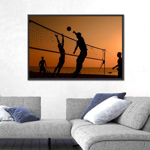 This lively canvas captures four players enjoying a spirited game of volleyball against a warm sunset backdrop at the beach. The energetic scene and silhouette style evoke a sense of fun and serenity, making it an inviting addition to any room.
