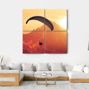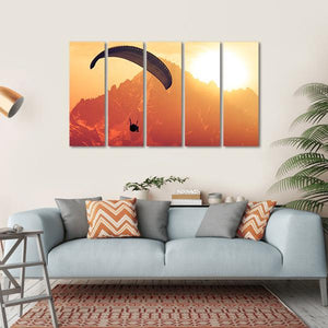 This canvas wall art captures the adventurous spirit of paragliding against majestic mountain peaks at sunset. The vibrant palette of oranges and reds, paired with the dramatic silhouette of a paraglider, creates a serene yet awe-inspiring atmosphere that complements any modern decor.