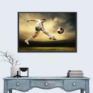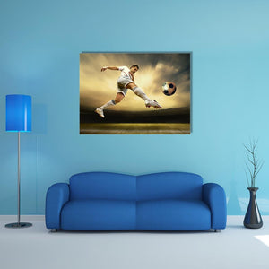 A dynamic canvas print of a soccer player mid-air, kicking a ball against a dark, dramatic sky lit by golden rays. The energetic, powerful image suits modern homes and sports rooms as a bold, contemporary piece of wall decor.