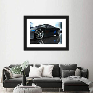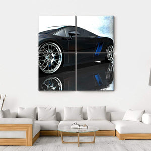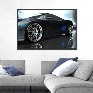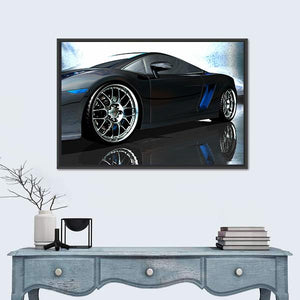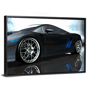 This canvas art captures a sleek sports car from a low angle, highlighting its chrome wheels and reflective details. The modern design features a striking palette of black, silver, and blue, conveying a powerful and dynamic atmosphere.