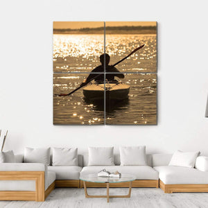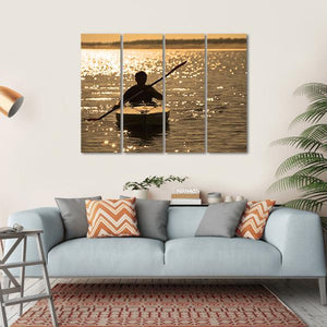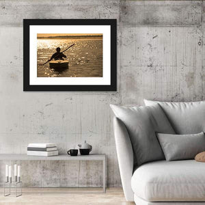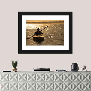 This canvas wall art depicts a serene silhouette of a kayaker gliding across calm waters at sunset. The warm palette of golds, tans, and browns enhances the peaceful atmosphere, making it a beautiful addition to any space looking to evoke contemplation and tranquility.