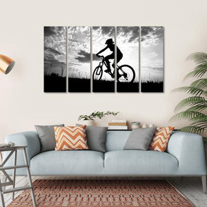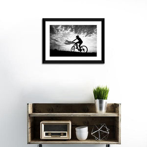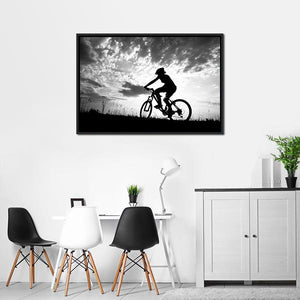 This canvas art features the silhouette of a girl biker on a bicycle against a backdrop of a dramatic sky and clouds. The piece captures an active yet serene moment, with a modern minimalist style that complements various decor settings.