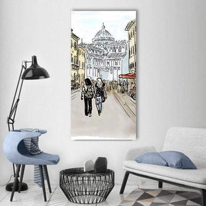 Sketch Of Street In Pisa depicts two women walking past European architecture and a domed building in a centered perspective. Rendered in a sketchy outline with a watercolor wash and an earth-tone palette with white, black and blue accents, it gives a quiet travel mood. This minimalist cityscape suits modern living rooms, hallways, or travel-themed décor.