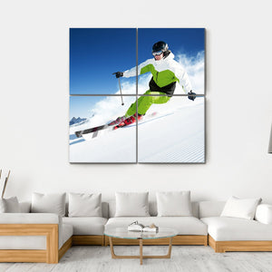 Experience the thrill of winter sports with this dynamic canvas featuring a skier navigating through a snowy mountain landscape. The action-packed scene showcases groomed snow tracks and vibrant powder spray, creating a crisp and bright atmosphere that brings the joy of skiing into your home.