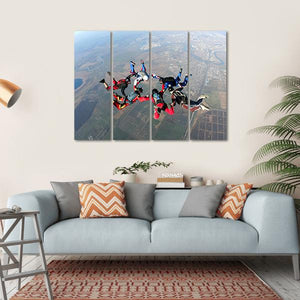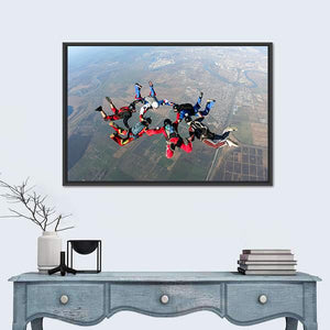 This canvas art captures a thrilling aerial view of skydivers forming a dynamic circle above a scenic landscape. With bold colors and a vibrant atmosphere, it adds an adventurous touch to any space.