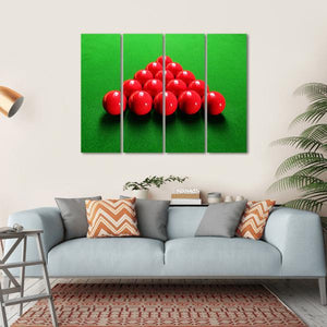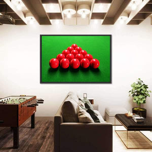 This canvas art captures the striking arrangement of red snooker balls in a geometric pyramid formation. With a palette of bold red and green, it promotes a focused atmosphere, making it an ideal addition to any game room or sports-themed space.
