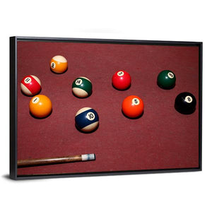 This canvas art captures an overhead view of a vibrant pool table scene, showcasing colorful numbered balls and a billiard cue. It's perfect for adding a touch of leisure and sport to your wall decor.
