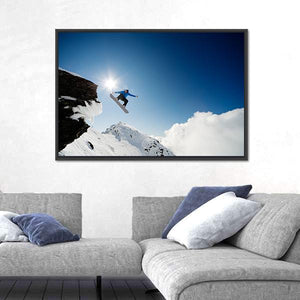 This canvas art captures the exhilarating moment of a snowboarder leaping through the air after a rocky drop, framed against a vibrant blue sky and radiant sunlight glinting off the snow. With a dynamic composition featuring a steep mountain slope, it brings an adventurous spirit to your wall.