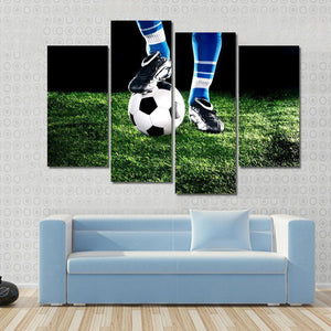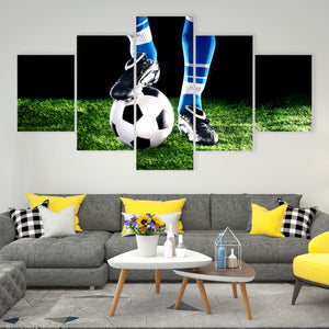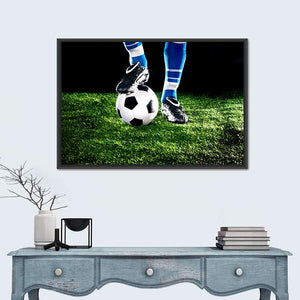 This canvas art captures a dynamic close-up of a soccer ball and a player's feet in action. The vibrant green field serves as the backdrop, filled with sporty energy and focus. Perfect for any sports-themed room or modern décor.