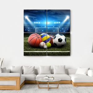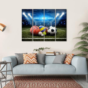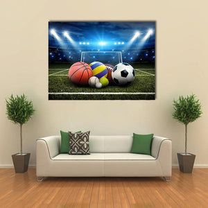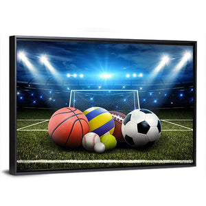 This vibrant canvas art features a dynamic mix of sports balls and stadium lights, creating an energetic atmosphere. Perfect for any sports enthusiast's wall, it adds a lively touch to your decor.