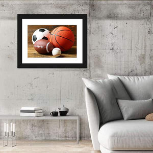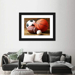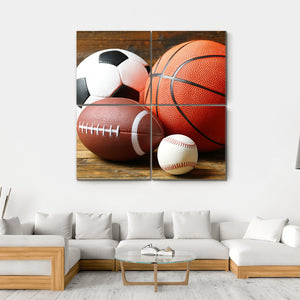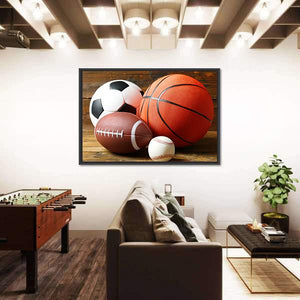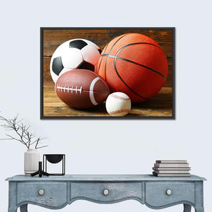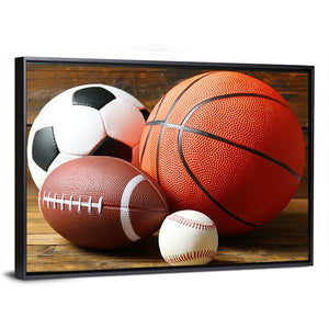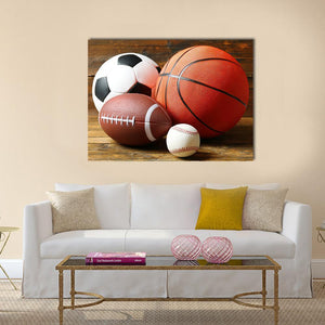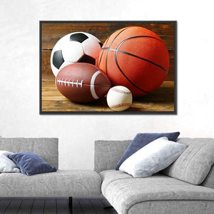 This canvas art features a dynamic arrangement of sports balls including a basketball, football, baseball, and soccer ball, all set against a textured wooden background. The energetic and classic vibe makes it a great addition to any sports enthusiast's decor.